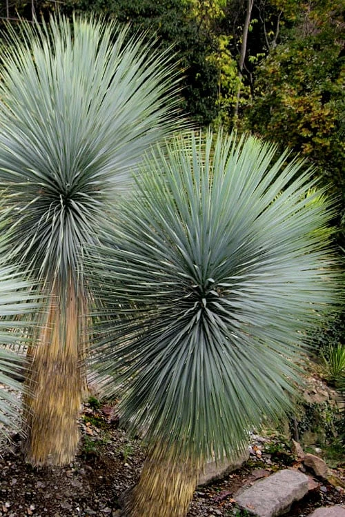 An extremely cool plant in every way, and highly ornamental and hardy, the Yucca rostrata, commonly known as Big Bend Yucca or Beaked Yucca, is a tree-like North American native species. Though it naturally inhabits western Texas and northern Mexico, where it can be found thriving on rocky slopes and ridges, it does well in other regions of the country in USDA Zones 5 to 11, which means it’ll handle temperatures down to -20F, or the most heat you can throw at it to Zone 11. When young, it looks more like a rounded shrub, but as it grows it forms an upright tree with a beautiful pom-pom-like, perfectly symmetrical globe of hundreds of soft, narrow, 2 foot long light gray-blue leaves. As it grows taller the old leaves fall off, or can be removed, which exposes the fibrous soft gray covering on the trunk. Large clusters of white, bell-shaped flowers on golden orange stalks tower above the foliage in late spring to early summer, depending on location. Performing best in well-drained to even rocky and sandy soils, Big Bend Yucca makes for a fine vertical accent tree or grouping in sunny to partially shaded rock gardens, landscape borders, and home foundation plantings. We suggest a minimum of 3 hours direct sunlight and good soil drainage.